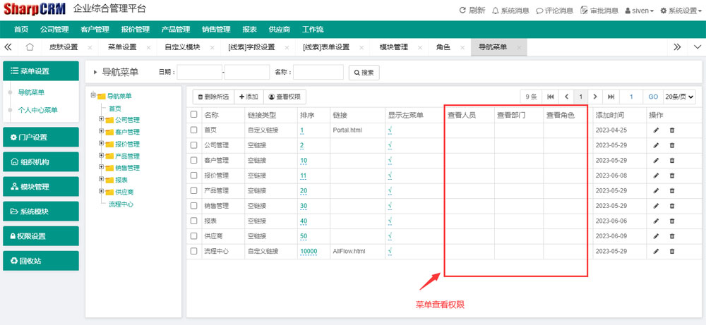 1、SharpCRM自定义管理软件可自定义【菜单访问权限】。